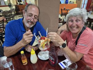 We left Tamarindo by public bus, headed towards Puntarenas. We spent 4 nights in Puntarenas, and should have spent only 2…not really a lot to do there. We had some nice meals, visited the aquarium, walked around a LOT. This is a sort of gritty, industrial town with a marina, a fishing port and a Cruise Ship Pier. Our AirBNB was just off the Oceanside promenade, so there were ample restaurants and walking opportunities. One day, while we were there, there was a Cruise Ship…a repositioning cruise leaving California and heading for the Caribbean. Unlike most Cruise towns, there was not an influx of overwhelming tourists…they all got on buses and went to see Sloths and Monkeys, I suppose.